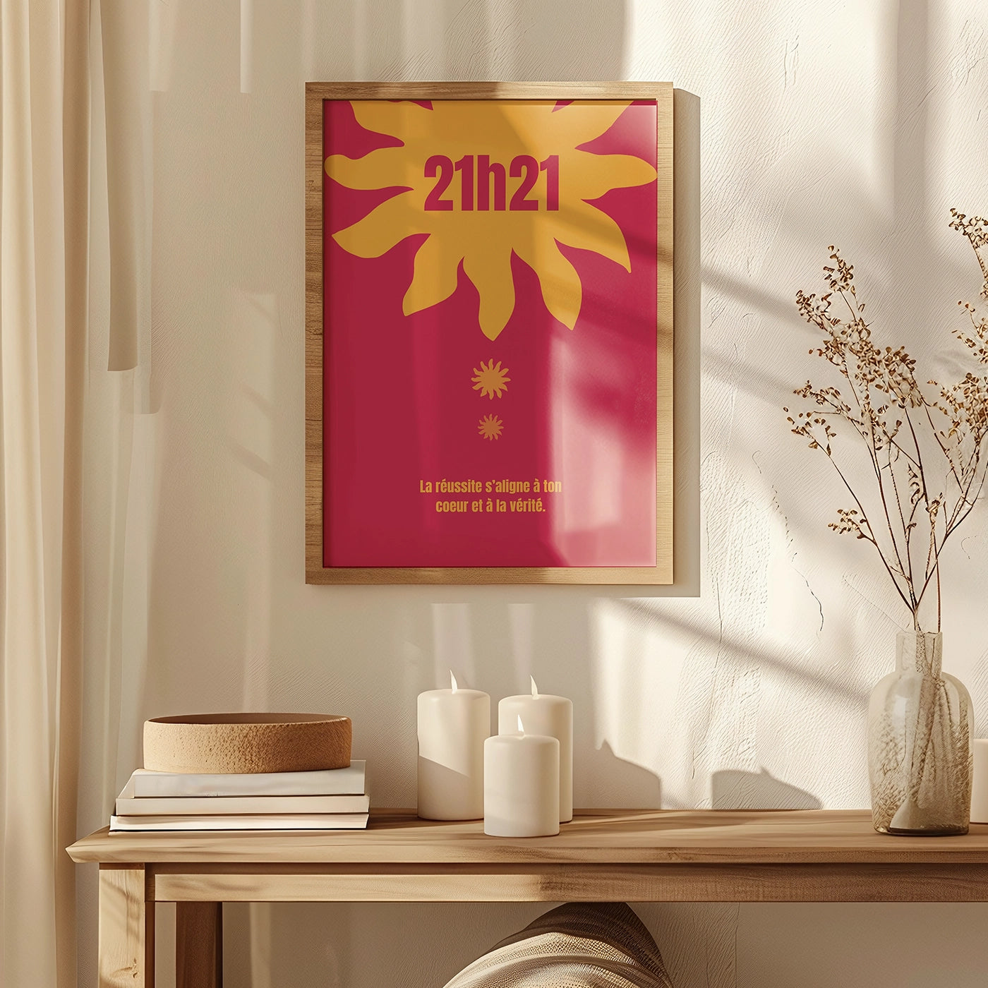 L'heure magique 21h21 symbolise la réussite et nous invite à manifester et ses intentions. Inspire-toi de ce chiffre grâce à cette affiche de notre série "Heures miroir".