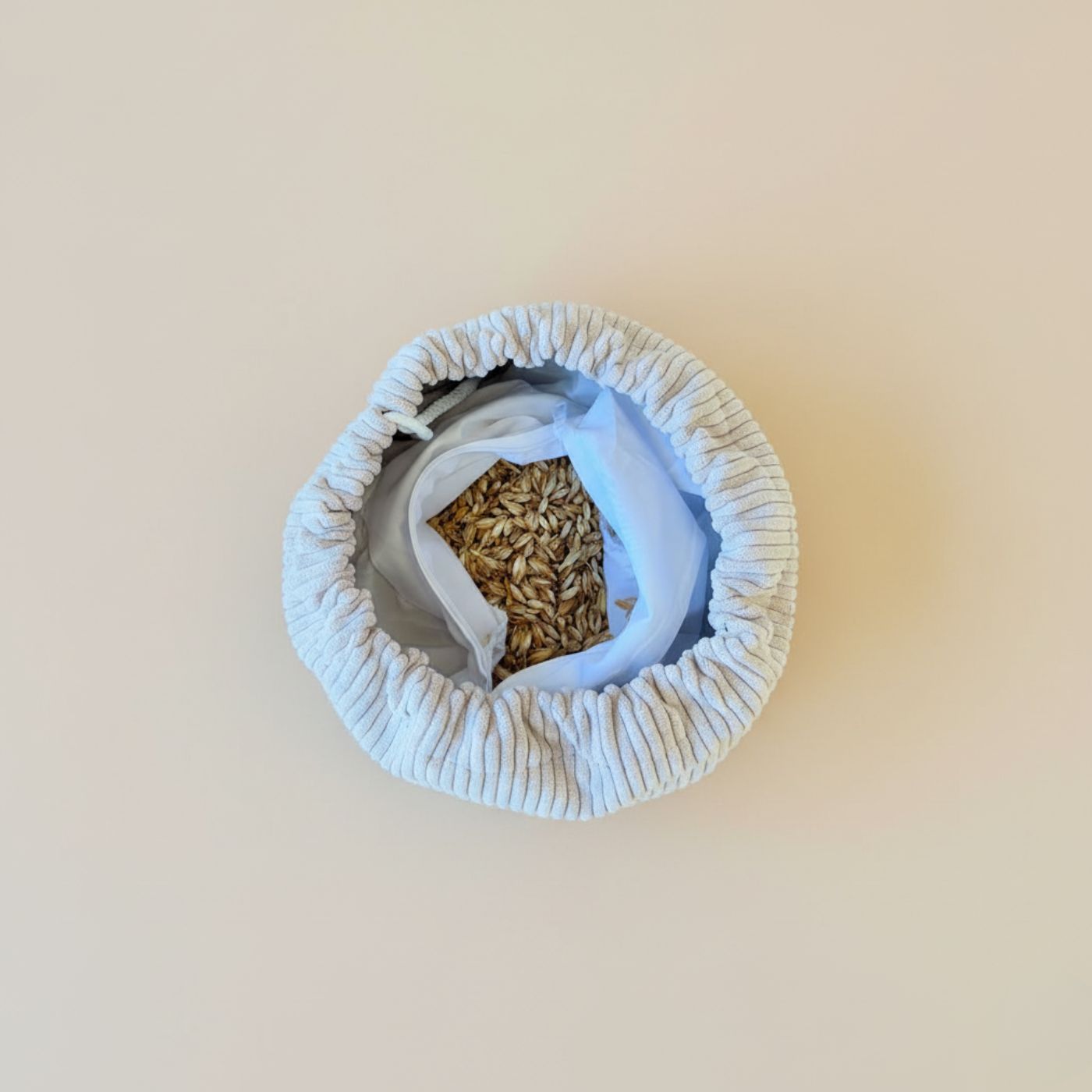 Ce bolster possède une housse en coton avec un cordon. Cela permet de le déhousser pour un lavage délicat ou afin d'ajouter/retirer des balles d’épeautre. Les balles d’épeautres sont contenues dans cette housse intérieure en coton.